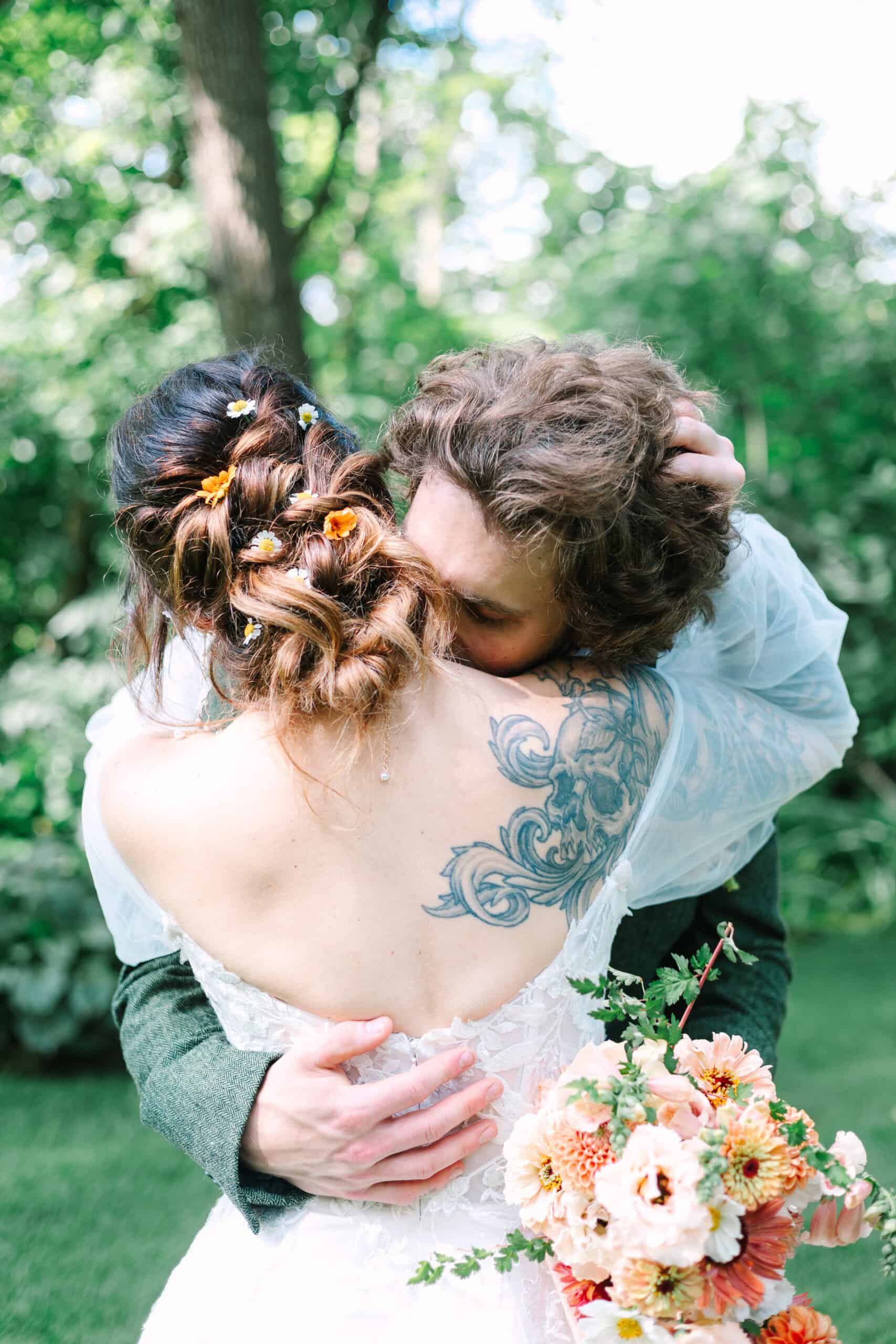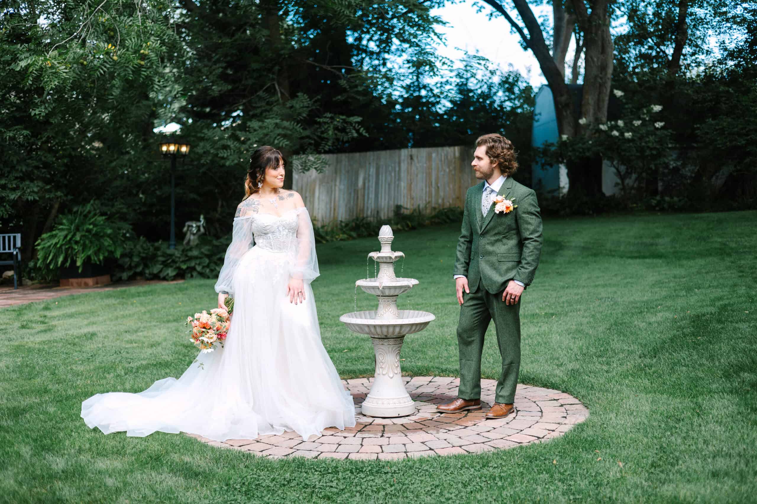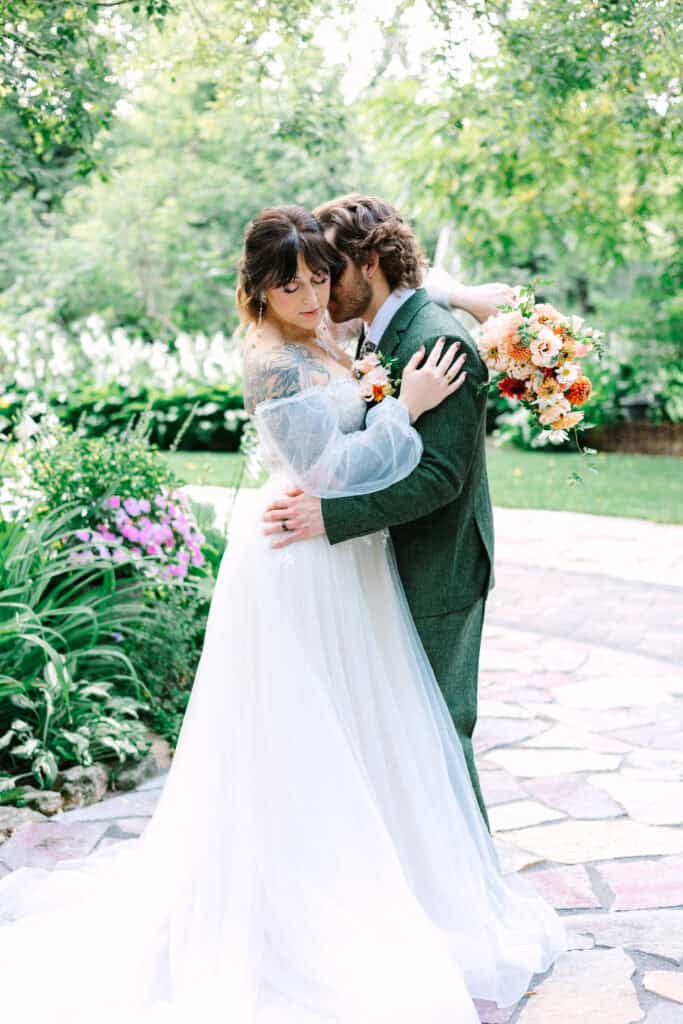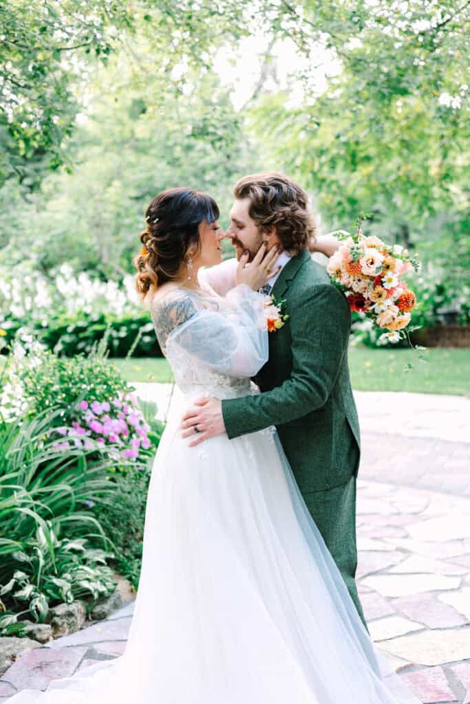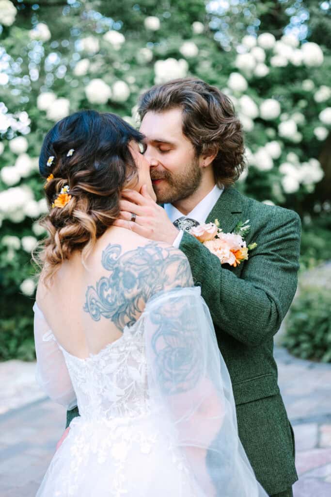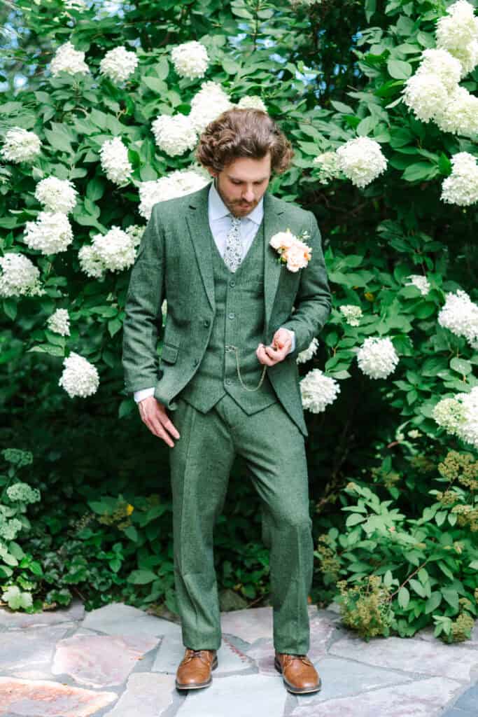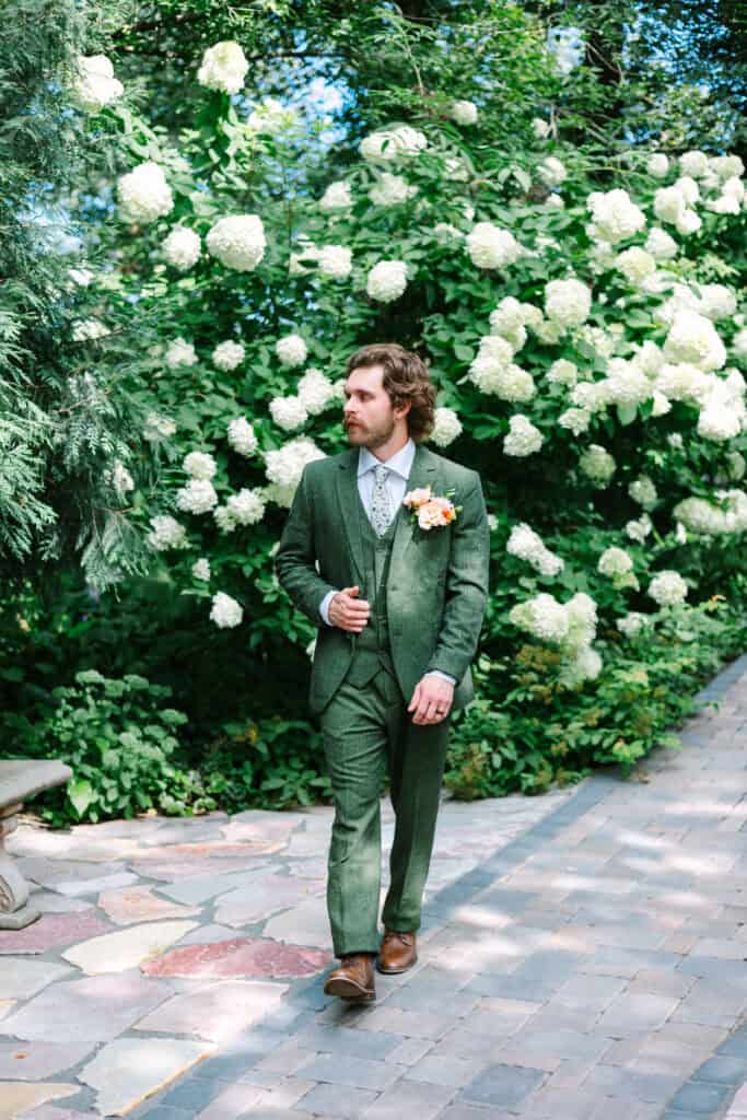 For the groom, the emerald green suit added depth and grounded the softer tones. The texture of the fabric paired beautifully with the greenery, and the peach boutonniere tied everything together without pulling focus.