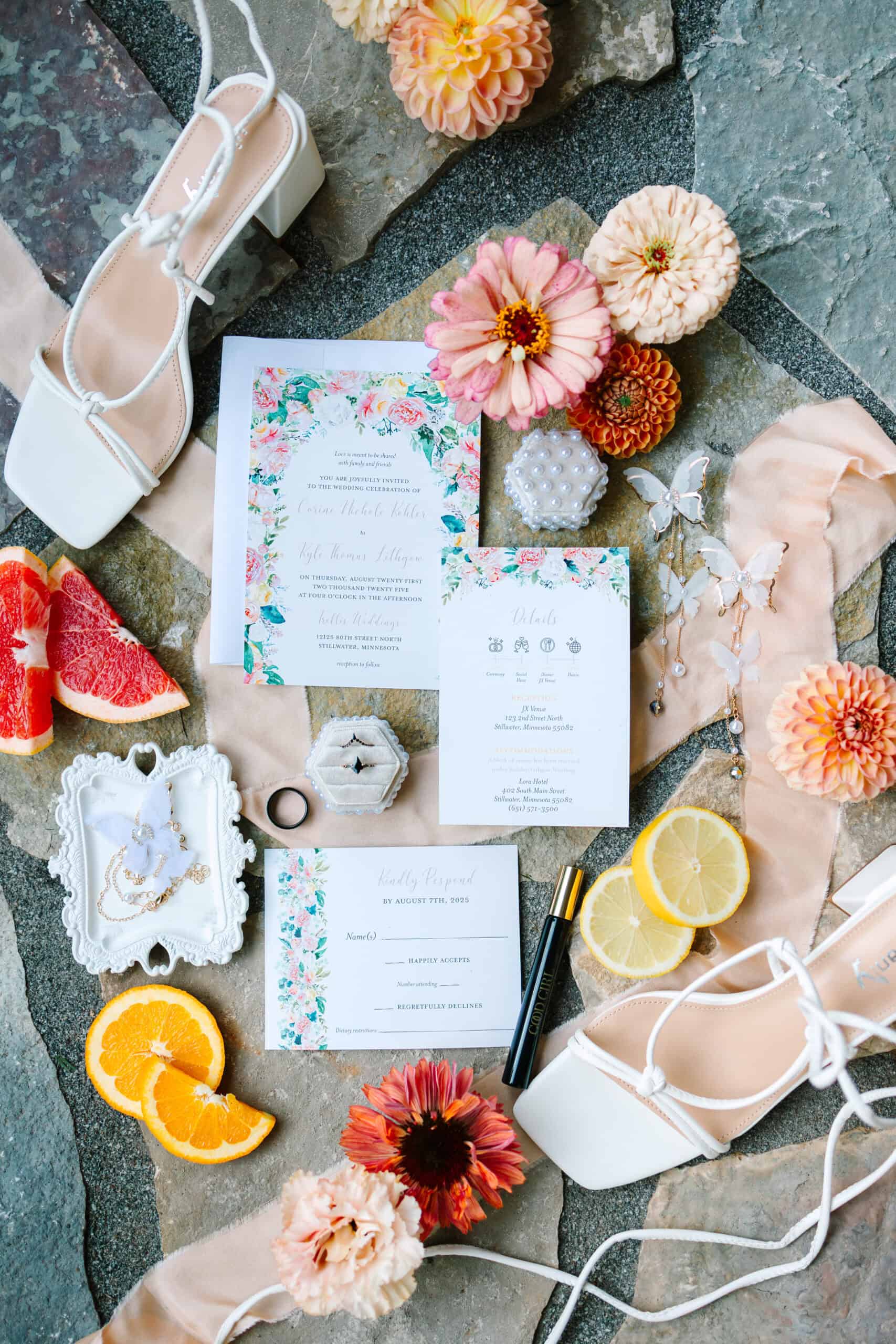 The stationery brought the color palette together in a quiet way. Soft florals, clean typography, and thoughtful layout. Styled with fresh citrus, florals, and personal details, the flat lays felt layered but not busy.