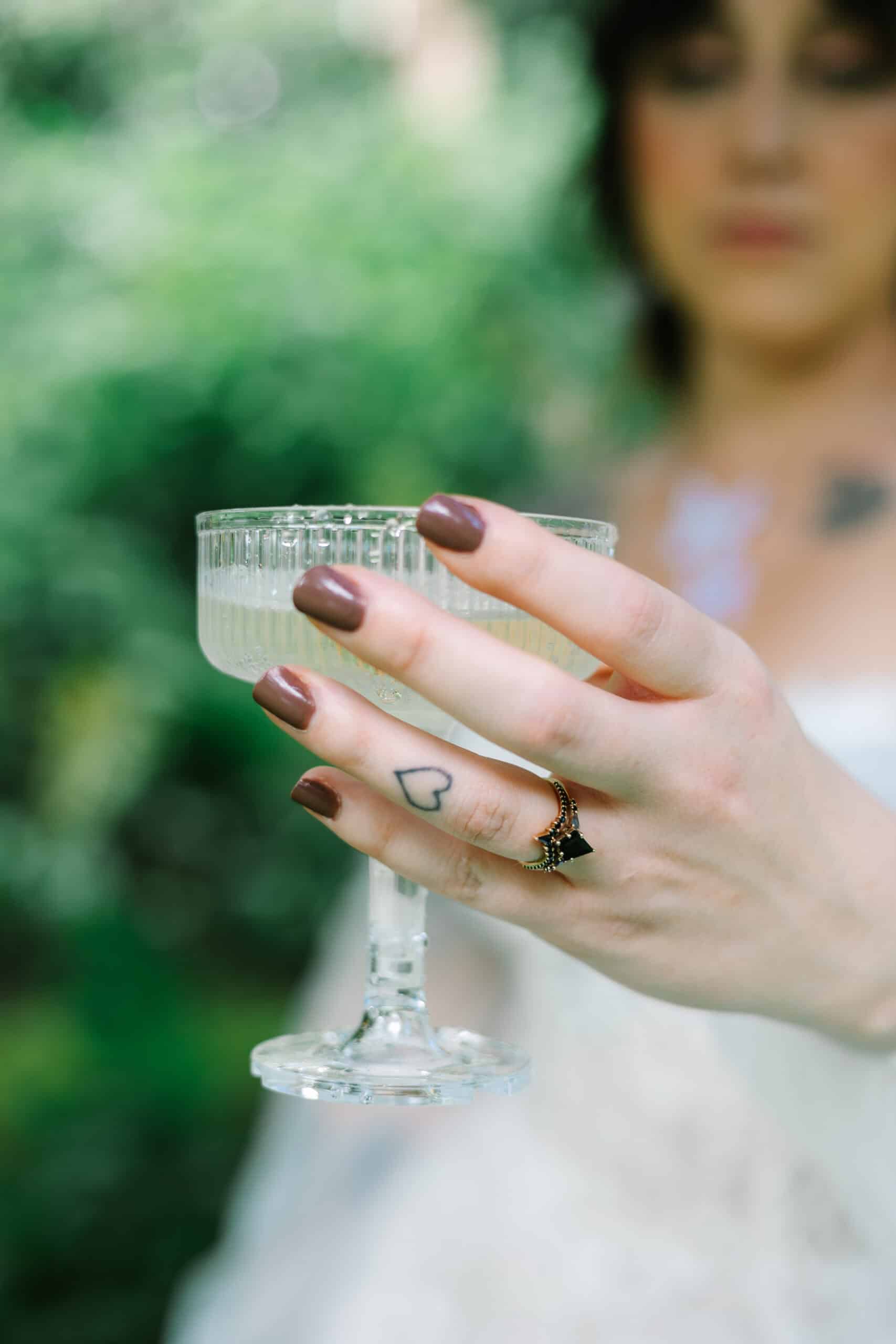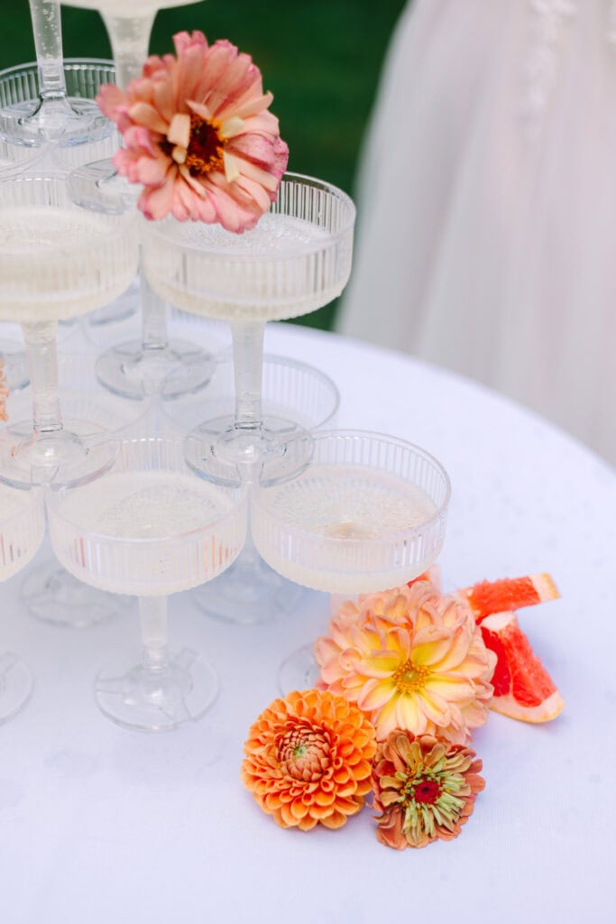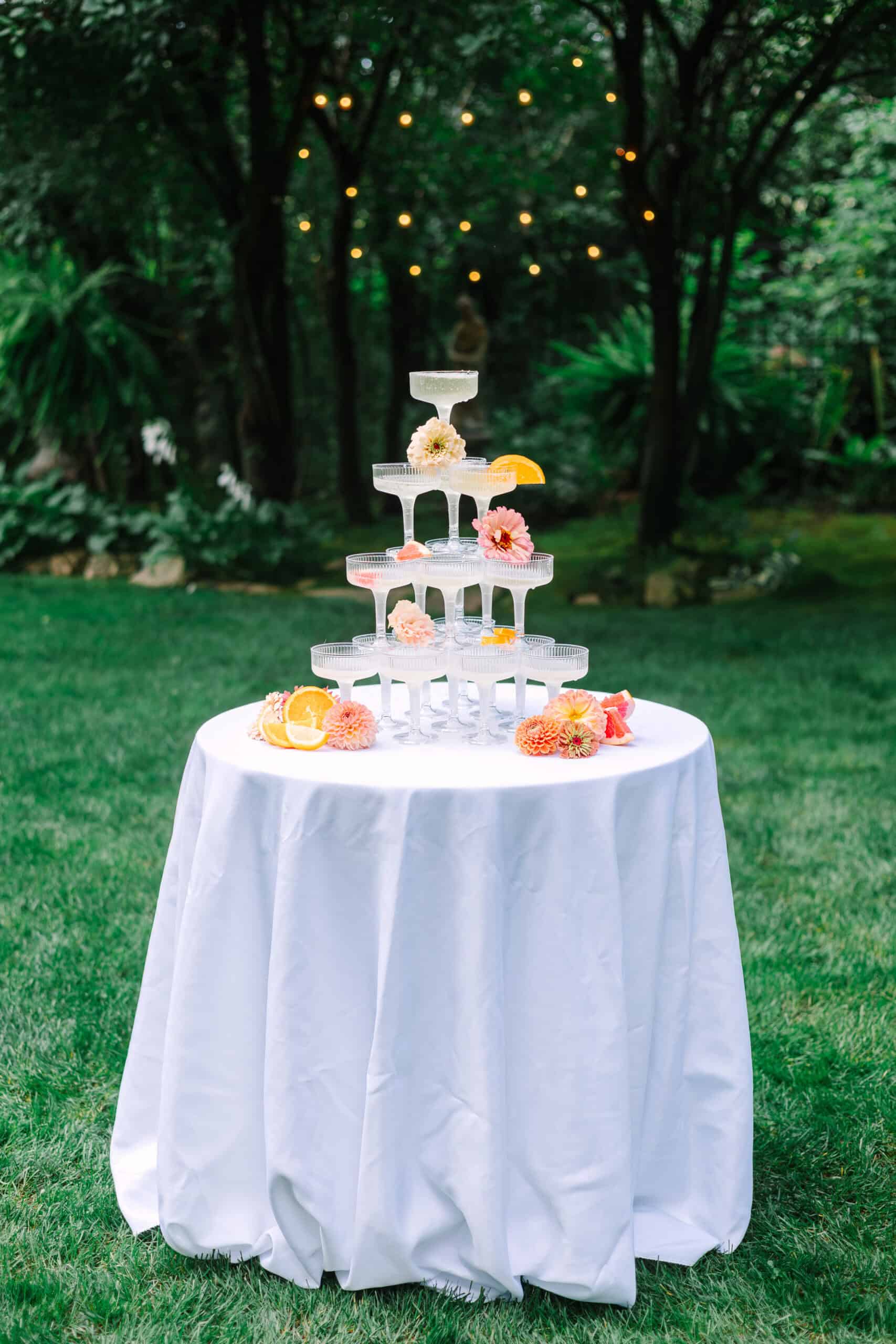 The champagne tower was set against a backdrop of deep green foliage and soft string lights. Clear glassware, citrus accents, and fresh florals kept it feeling light and intentional. It felt editorial but still realistic. A fun option for couples who want a statement moment that feels celebratory rather than formal.