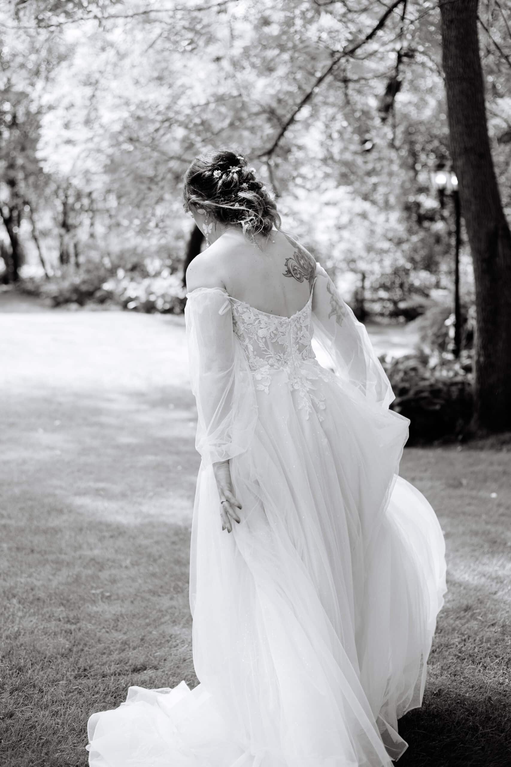 The dress added to that softness with sheer sleeves and light movement. When the fabric caught the breeze, it created motion that made the portraits feel alive rather than posed.