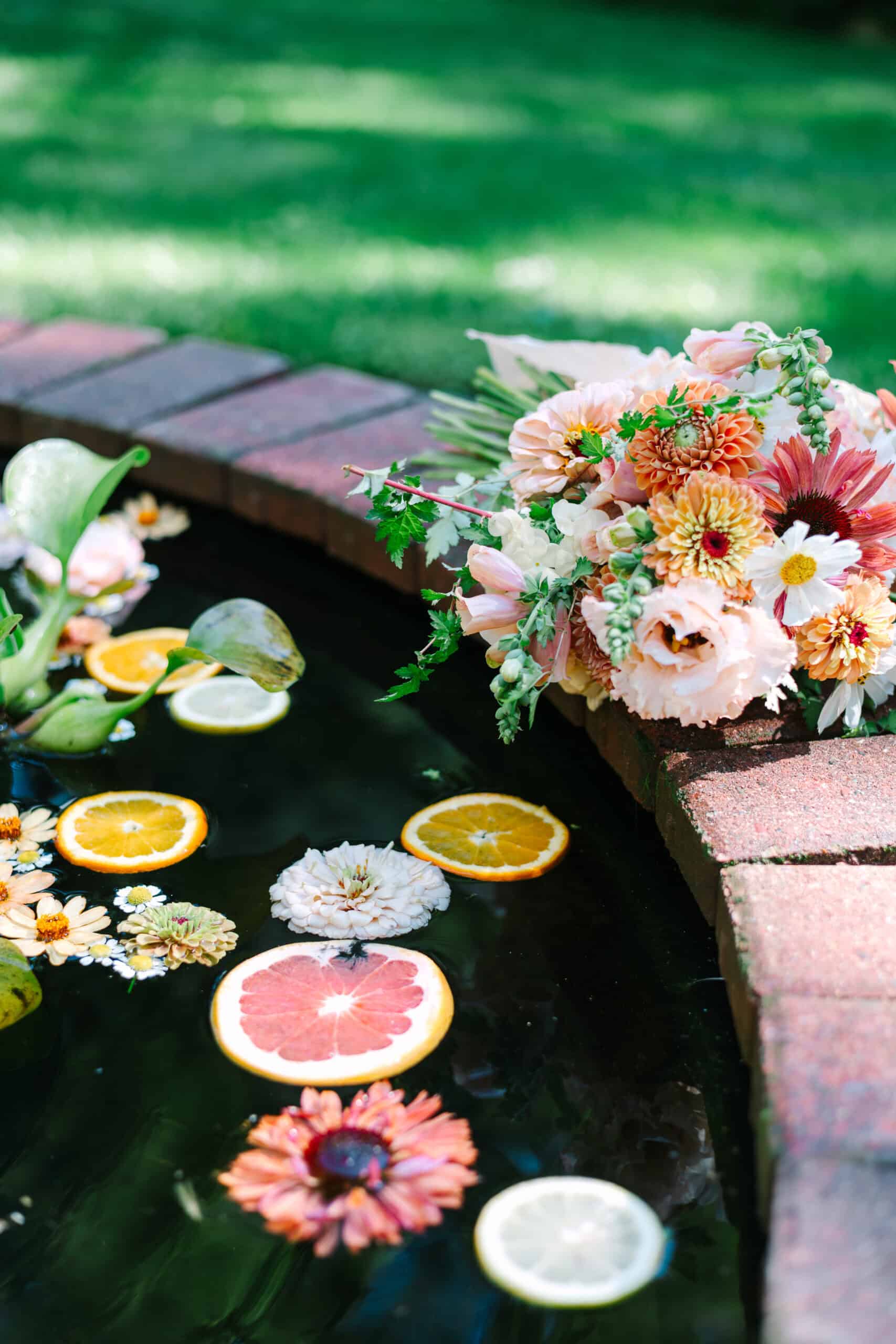 The color palette was built around peaches, soft pinks, buttery yellows, and white. Warm tones that felt natural against the deep greens of the venue. Nothing too bold. Nothing too muted. Just enough contrast to feel elevated while still blending into the surroundings.