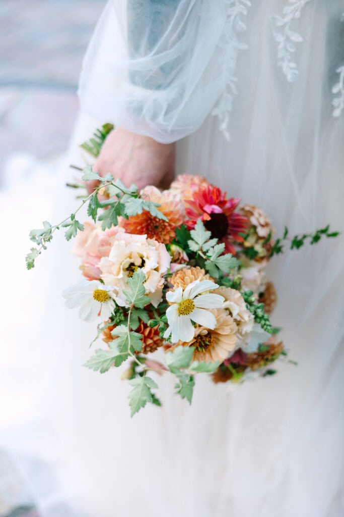 Florals were designed to feel organic and slightly undone. Loose blooms, soft textures, and movement were key. The bouquet felt garden grown rather than arranged, which matched the overall tone of the shoot perfectly.